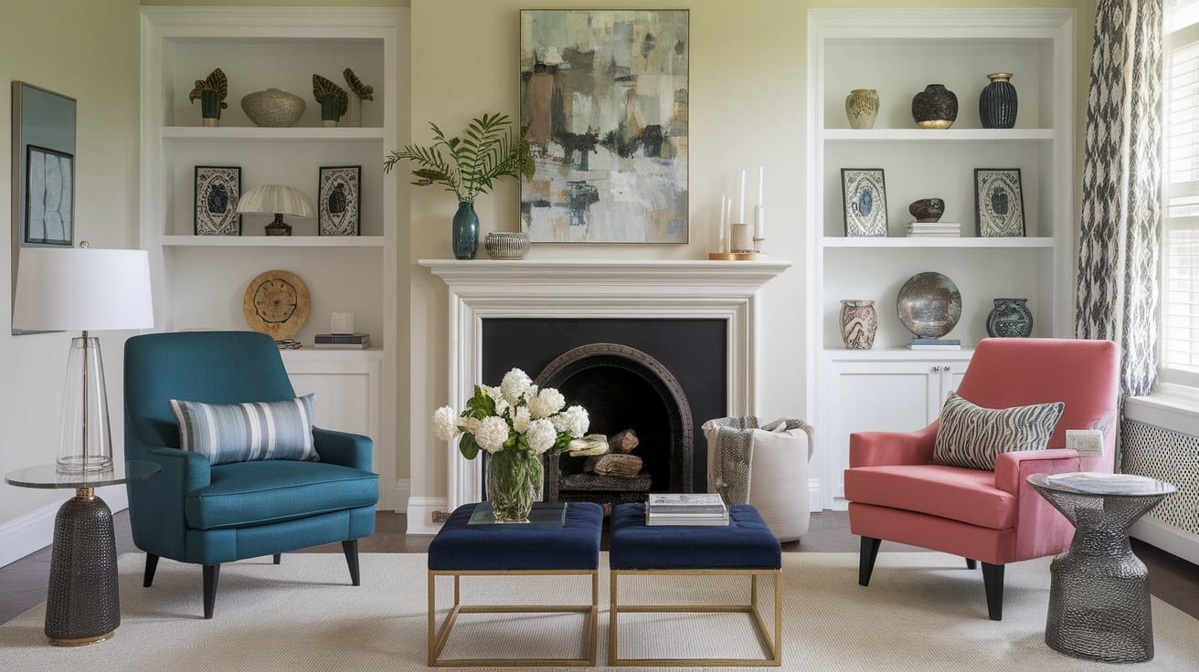 Pair them with a simple sofa and solid-colored cushions to avoid overwhelming the space. A patterned chair can anchor the room and set the tone for a vibrant, stylish look.