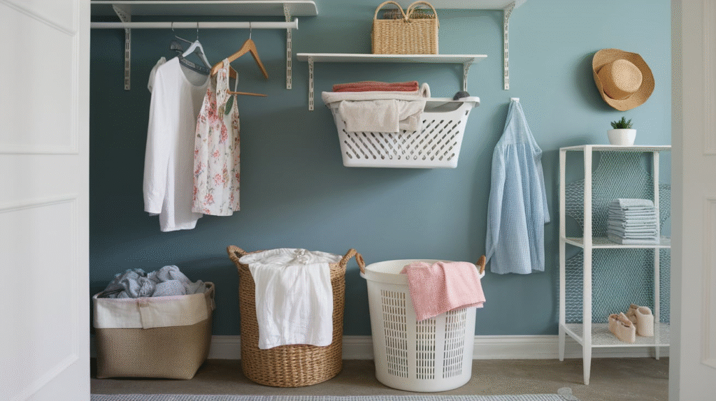 Keeping your laundry room organized can be a challenge, especially when baskets take up too much space. Laundry basket storage