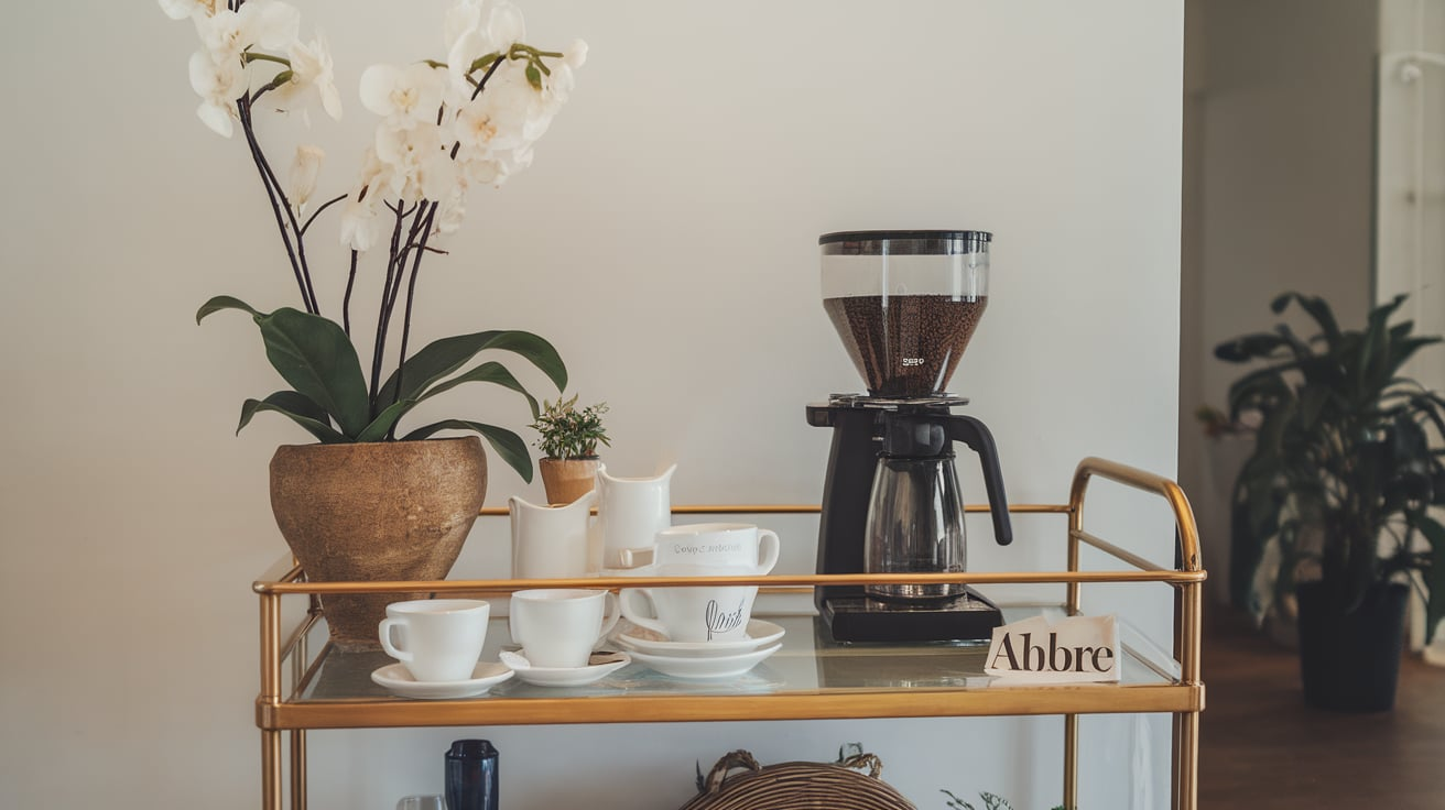 Enhance the setup with a small tray for syrups and a canister for sugar or stirring sticks. The mobility of a bar cart lets you move your coffee station to different areas, perfect for hosting or rearranging your space.