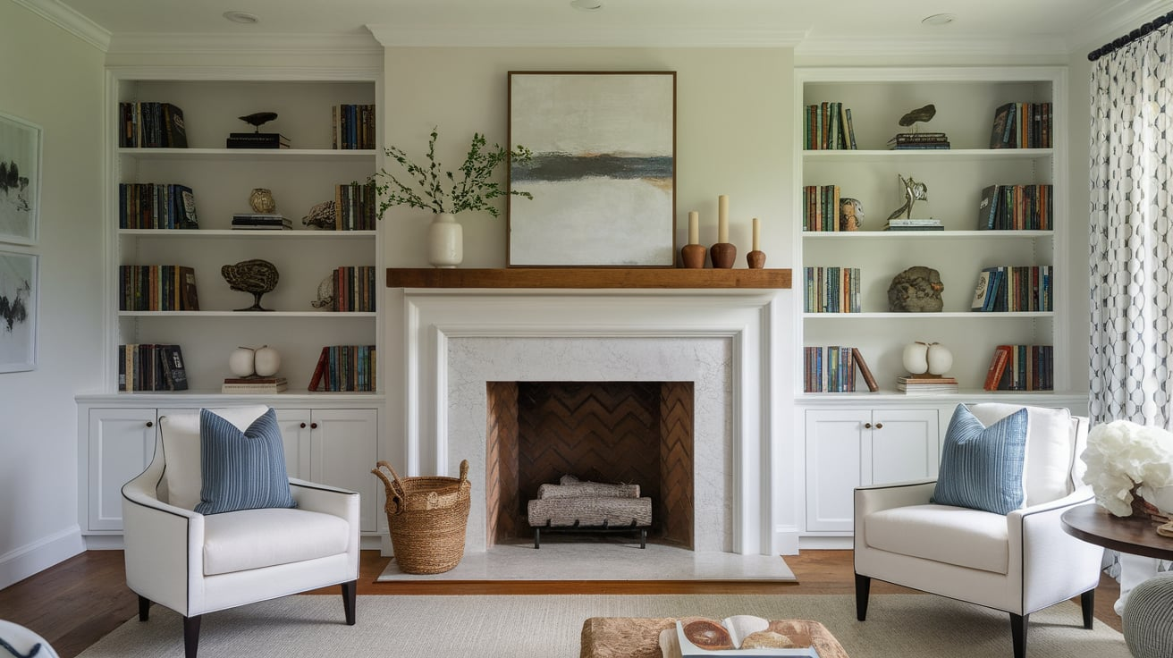 Built-in bookshelves flanking a fireplace create a seamless and elegant look. This design makes your fireplace the center of attention while providing ample storage space for books, framed art, and decorative items. You can customize the shelves to match your home’s style.