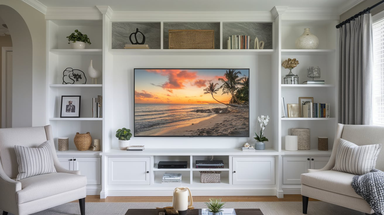 A built-in entertainment center offers a polished, seamless look that blends perfectly with your living room walls. It provides plenty of storage for media accessories, books, and decorative items, making it both functional and stylish.