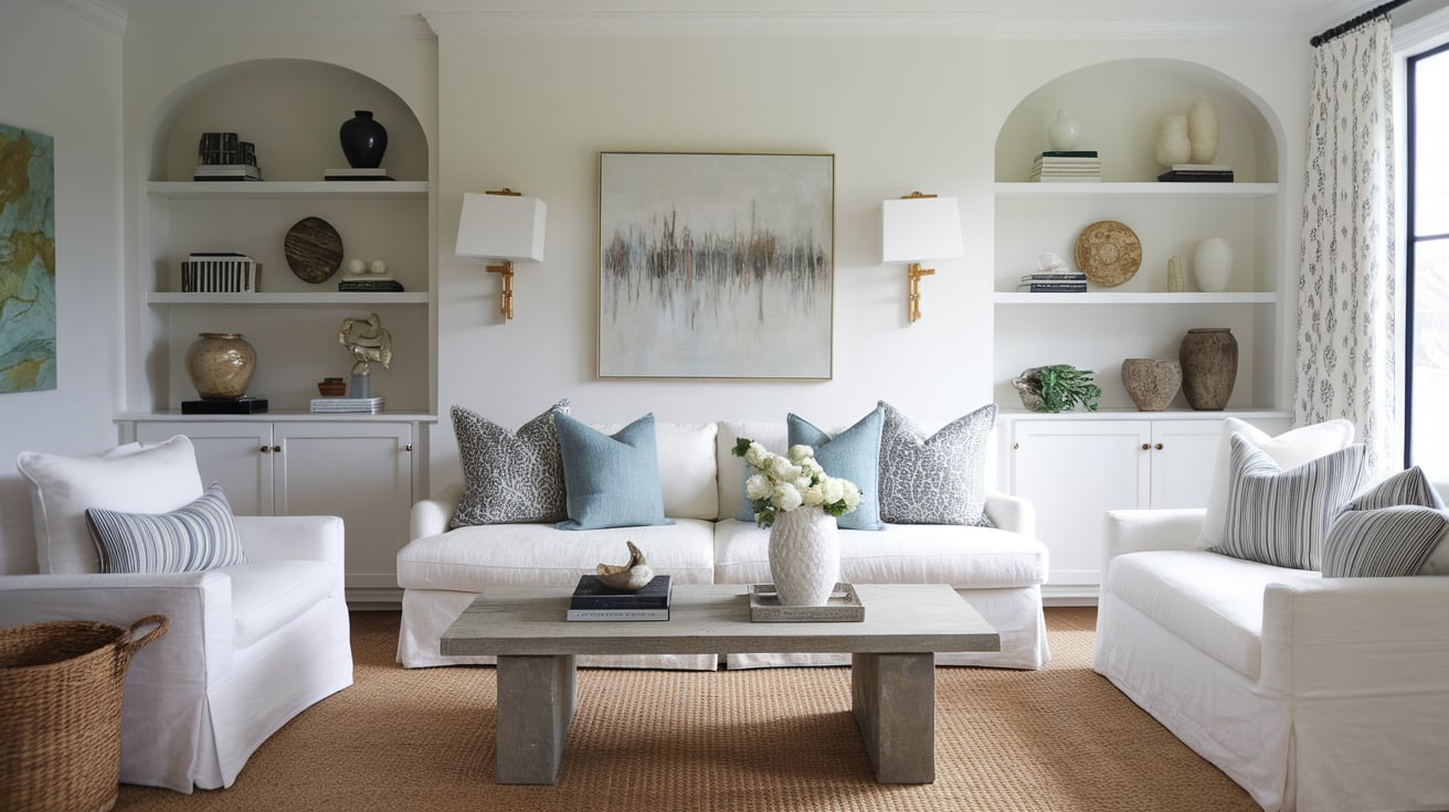 Incorporate other textured elements, like a reclaimed wood coffee table or a stone vase. The contrast between smooth and rough surfaces adds interest to the space while keeping the palette neutral and serene.